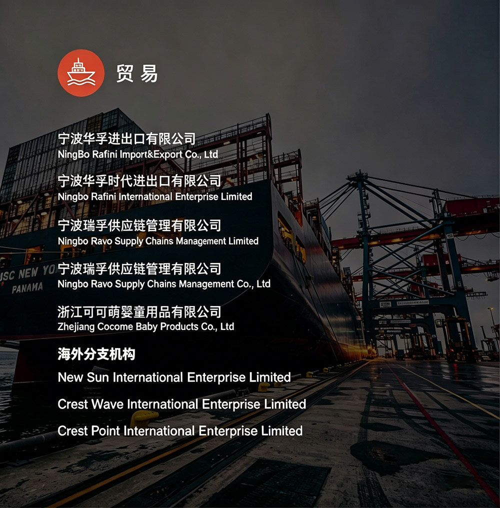 集团拥有100万方的生产基地,分别位于宁波江北、河南信阳,越南西宁及德国索林根。继2004年于香港成立第一个海外营销中心后,德国、巴西、美国等海外中心陆续建成。3000 多名瑞孚员工为遍及全球的800多家头部商超、品牌商提供一站式的供应链服务。
